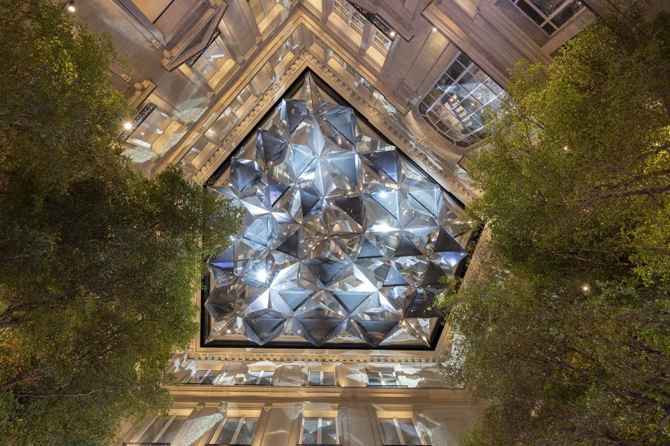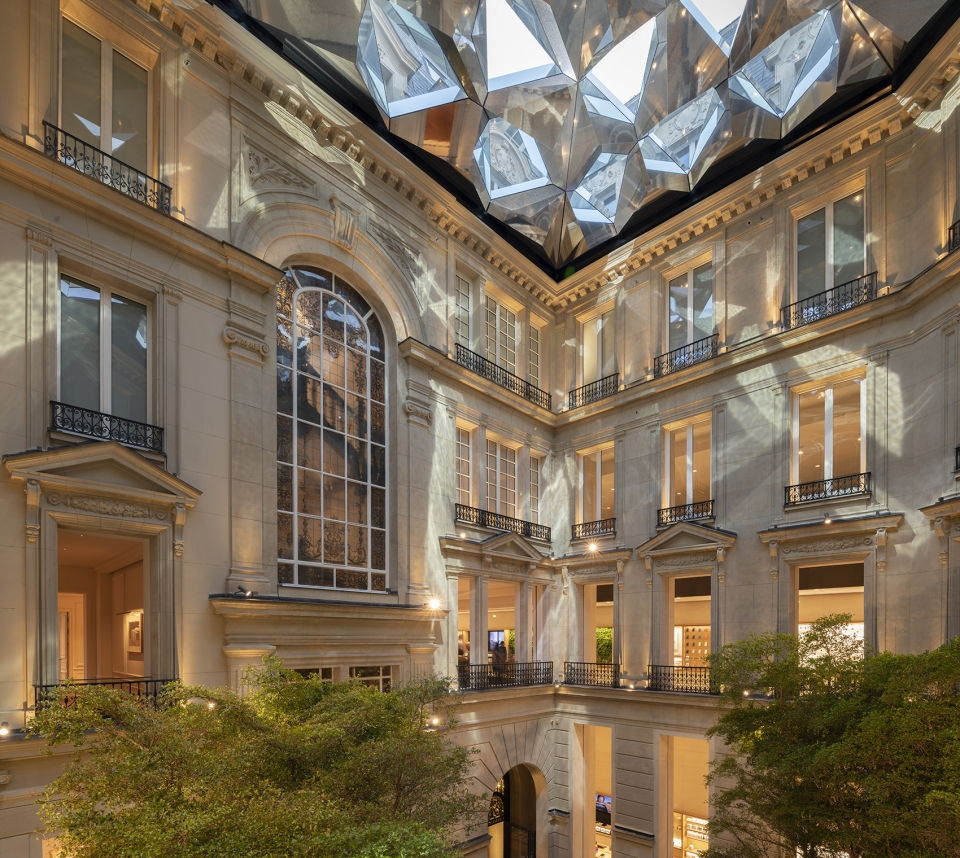 这栋历史气息浓郁的建筑似乎是从电影里拷贝出来的,有着古董珠宝的繁华,又有着说不清道不明的历史味道,设计师需要用新的事物去改变它,却又不改变它。庭院顶部有个万花筒状的采光天窗,它带来了绝美的光影,上方表面由光伏板覆盖,碎片合成后像一枚巨大的钻戒,通过阳光投射下来,光影斑驳,如金溪流淌。
