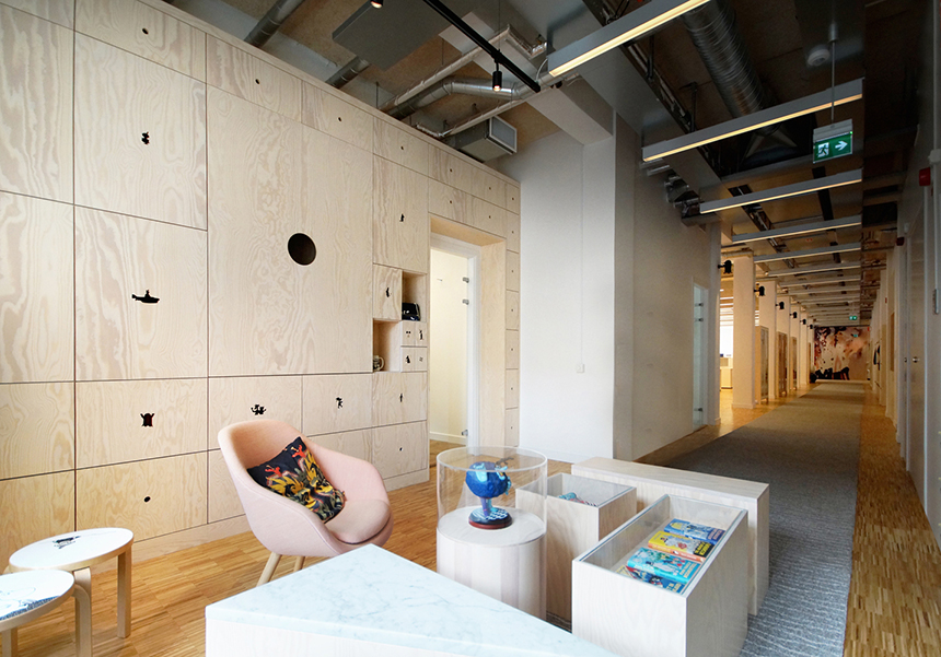 办公室室内设计致力于创造一个多功能的工作空间,通过定制的橱柜以及室内装饰的数控壁画,使得建筑兼具展示公司经典的斯堪的纳维亚品牌的功能。