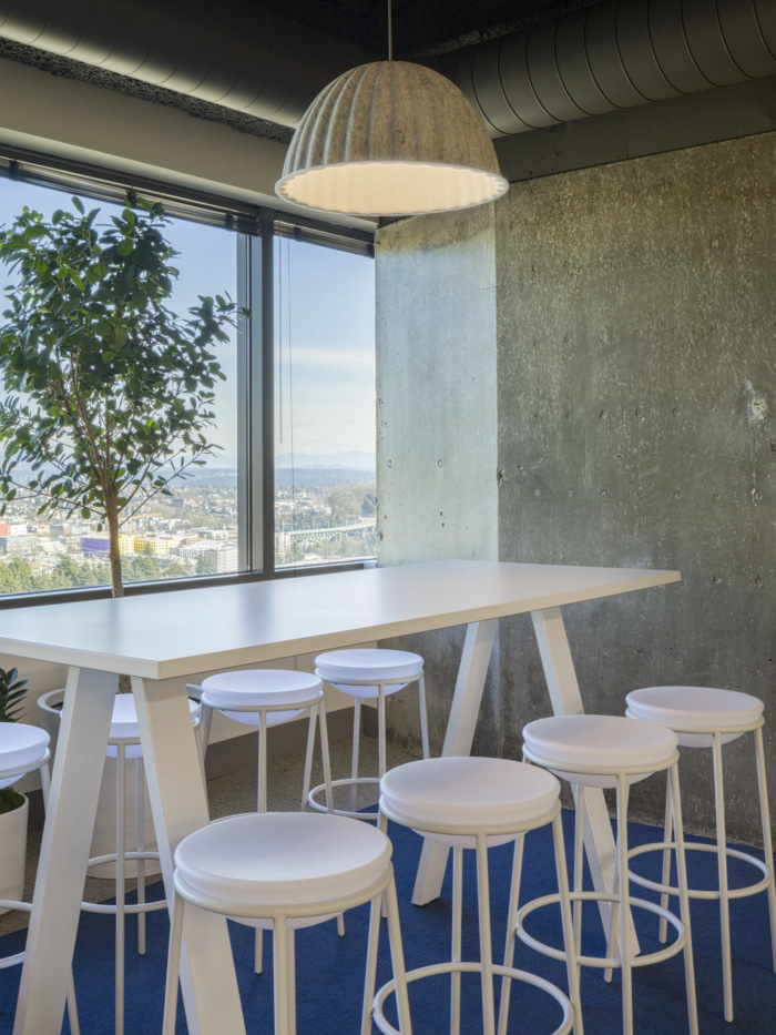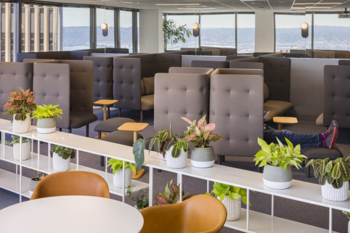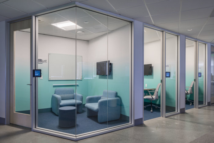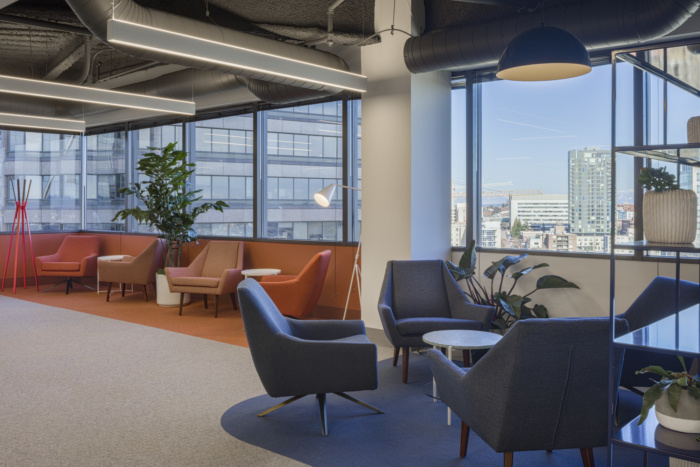 在这个办公室环境装修设计项目中必须有鲜艳的色彩-来自医疗领域,许多团队成员认为传统的医疗空间(甚至办公室)通常是通用的,几乎太中性了。图书馆和周围休息室的色彩爆发有助于消除这种陈规定型观念,地毯和饱和家具的精心更换会在整个办公室内营造出这些色彩斑斓的时刻。