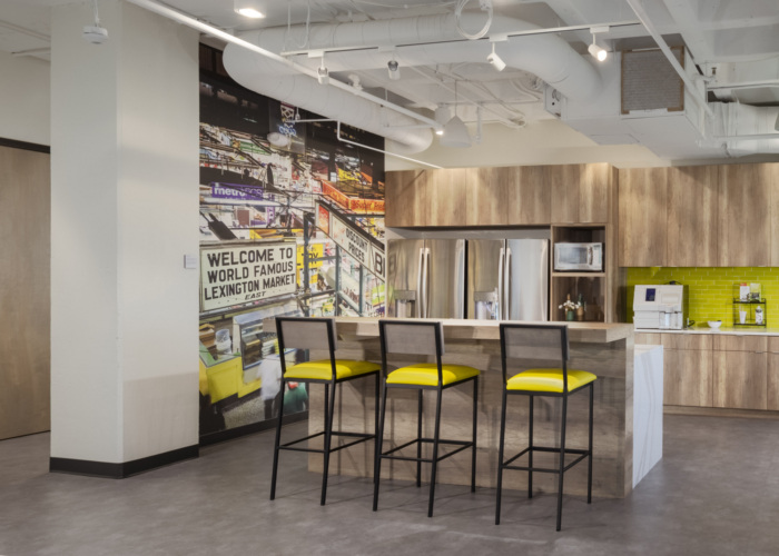 巴尔的摩的真实感觉被编织到办公室里,以讲述一个故事和荣誉,该组织每天都在推销“魅力之城”。泡泡糖粉红色的墙纸上点缀着柠檬薄荷棒的图像、带有大理石弯头的经典砖排房屋外墙以及专为城市中每个居民区建造的墙,都是对这一荣誉的致敬。