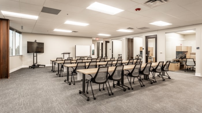 举办活动、举行私人会议和提供款待的灵活性是该办公空间设计的关键。折叠玻璃隔墙完全通向欢迎休息区,设计师提供的会议桌营造出高档的会议室外观,但提供了充分的灵活性,可以转换为培训桌或折叠和嵌套,可随时调整且不占用空间。