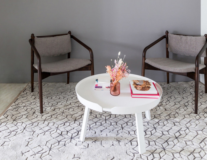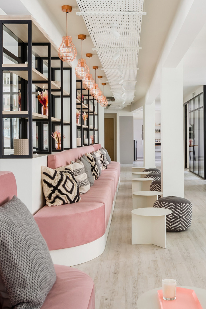 空间的装饰是女性化、现代和精致的。该品牌的VI颜色已被用于带来柔和的触感并柔化全白色的空间外观。一些装饰元素,比如花束,设计师安排了干花来装饰个性化办公室,希望将办公室装修设计成为一个真正的美丽殿堂。