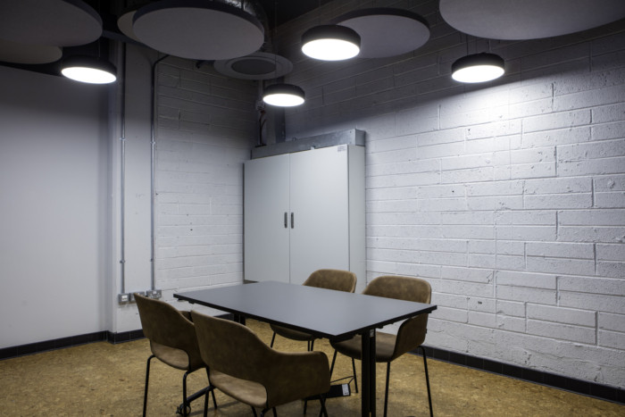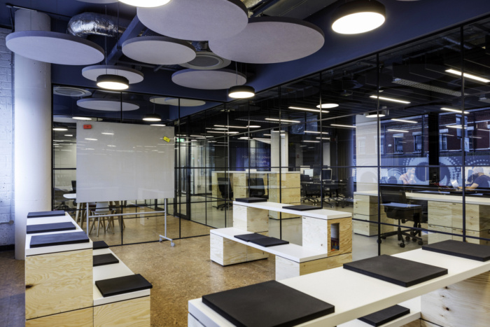 其办公室设计装修具有工业风格,色调以黑色、深蓝为主,光影结合,用圆形元素柔化空间,营造一个高效、静谧的办公环境。每个办公桌和工作区都特色定制,以满足任何个人对坐、站、协作等的偏好。