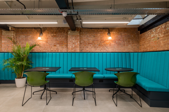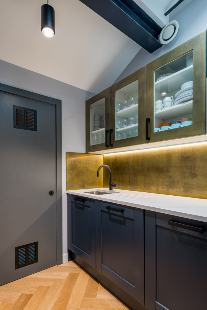 位于原始倾斜屋顶下方的第一层空间被设计为一个更安静的空间,配有固定和分配的办公桌。地板采用木材制成,后窗采用黑色框架和临界风格,与底层的窗户和分隔墙相匹配,侧壁和大部分前后墙都是喷砂砖,再次庆祝原始建筑结构。#写字楼办公空间设计装修#