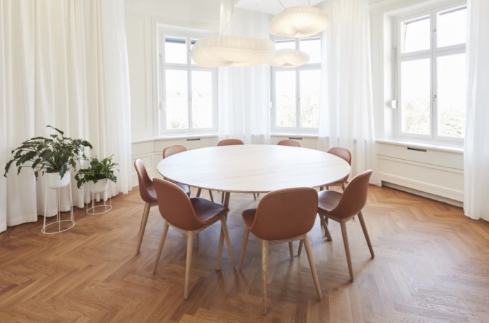 精致的细节与较重的橡木和实木材料形成鲜明对比。如今,占地1,800 平方米的两层楼包括60个工作场所,这些工作场所的特点是自然风光、传统工艺和现代设计巧妙结合。#高端办公室装饰设计#