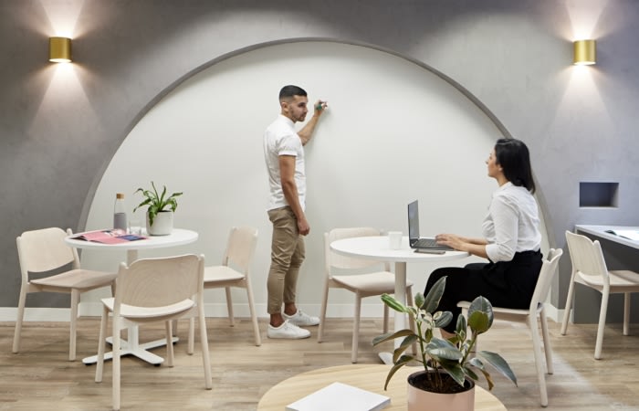 引入突破空间是一个优先事项,为非正式合作提供缓解和空间。轻质家具和木地板、白板拱门和各种座位选择抵消了颜色注入,构成了这个多方面的空间。这个工作场所不仅仅是一个吃饭的地方,而是鼓励离开办公桌去开会和参与协作。