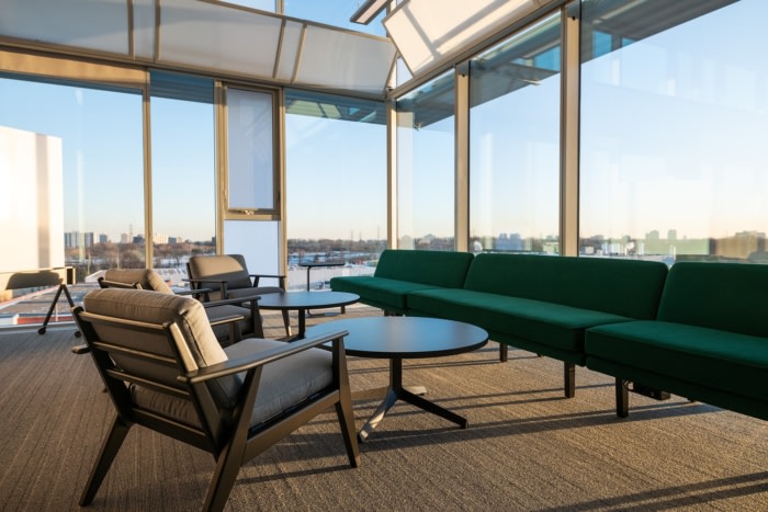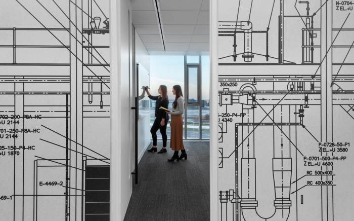 象征着环保意识态度的定制艺术品装饰在空间墙壁上,手绘建筑图纸制作的图形也是为了庆祝公司的光辉历史。各种工作环境遍布各处,更能随处享有城市美景。
