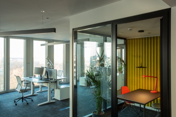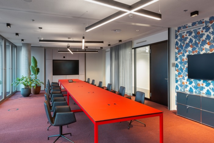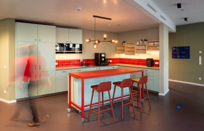 新空间相应地活泼多变,非常不同的工作区域已经整合在两层楼上。休息室、现代团队区、开放式会议区、智库和用于头脑风暴的创意空间、带沙发、躺椅和隔音窗帘的安静房间——员工可以根据工作阶段选择不同的设置。整个设计由小巧的配套配件以及良好的可持续材料和家具组合而成,室内设计团队有意将不同的纹理并置,并结合多彩和极简元素。