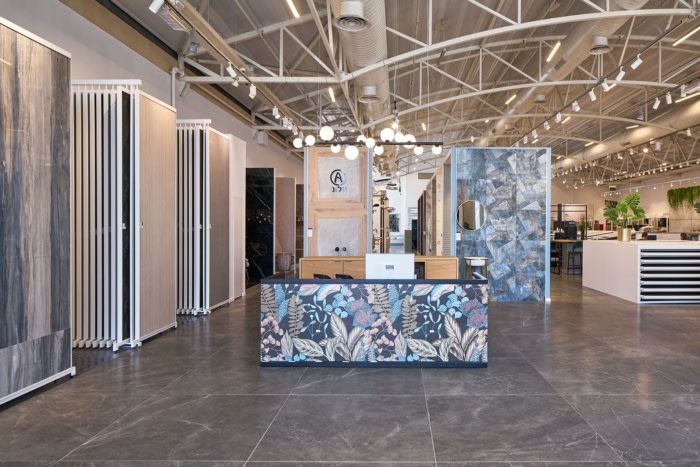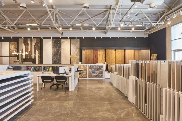 尽管展厅里展示了许多产品,但企业工作的主要目标是为参观者创造一种开放和愉快的感觉。出于这个原因,设计师决定只使用黑色、灰色和白色,并避免在入口处设置高大的展示墙,而是将它们放在后面,以便可以看到房间的全景。#高档办公室装修#