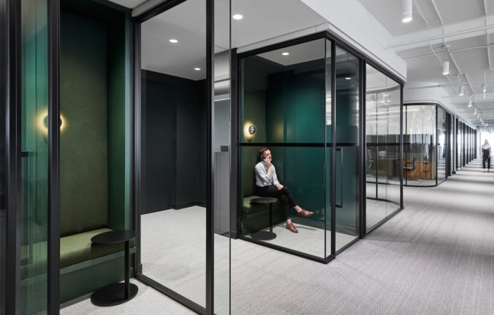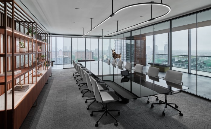 会议和董事会议室的玻璃创造了一个画廊风格的走廊,提供不间断的视野。带有弧形拐角的烟熏玻璃正面可以反映城市风光。从会议室内部,一个定制的青铜盘绕雄鹿雕塑藏在走廊的角落里,监督着商业交易,也象征着人类对自然的影响。