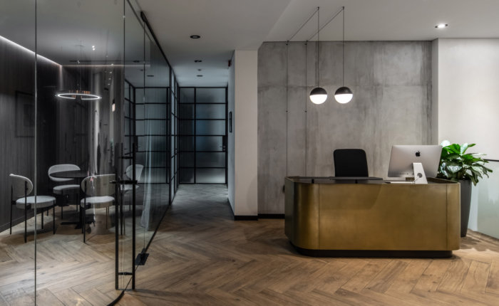 新办公室的两层在风格上有所不同,但同时保留了设计的完整性和整体画面的体量。一楼是凉爽的苦行僧,灵活而活跃。第二个是温暖的不拘一格,平静和平衡。接待区的不锈钢和从地板延伸到天花板的钢筋。这里没有可见的紧固件,所以好像金属射线穿透了水磨石并在高处的某个地方迷失了方向。