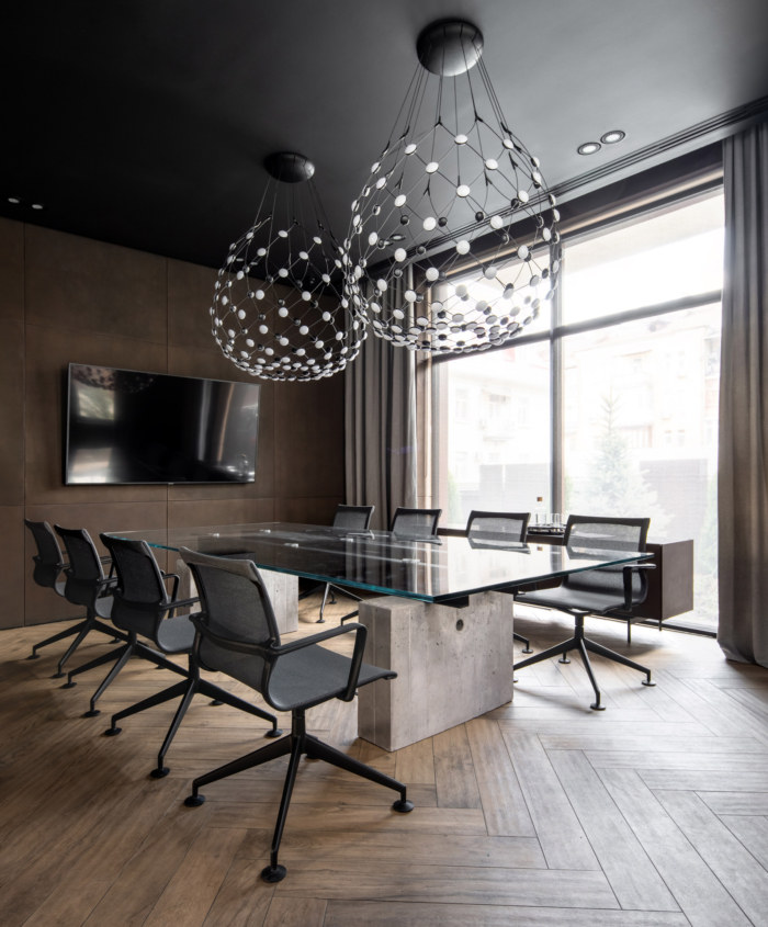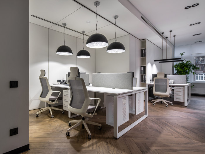 二楼办公室的设计采用白色调色板。有时,白色会被木板和栏杆稀释,从而产生一些墙壁动态。强调简约的灯光赋予空间韵律。在桌子附近,有玻璃板,由于其镜面效果,使空间更深。#高级办公室设计装修公司#