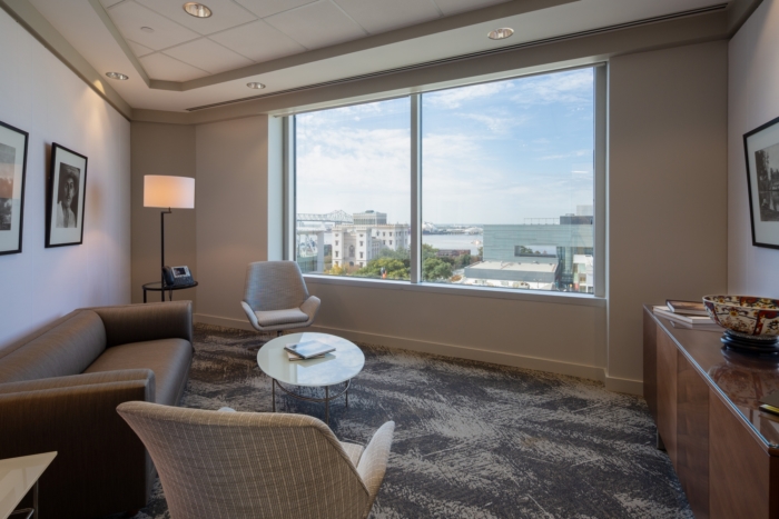 宽敞的主大堂和办公室采用暖灰色调,灵感来自附近路易斯安那州议会大厦的金属制品和石灰石外墙。为了向 1930 年设计的摩天大楼本身致敬,装饰艺术风格的照明、地毯、图案和建筑细节赋予空间永恒的精致。垂直胡桃木面板与以石材为灵感的地板和定制金属屏风形成纹理对比。玻璃幕墙充分利用了高处的位置,有助于为室内注入自然光。