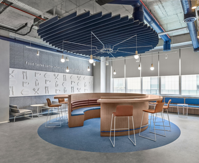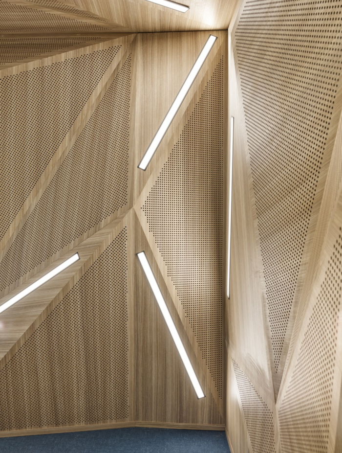 隔音在开放式办公室中极为重要。为每个团队保留的特定枢纽的天花板采用“Feltouch”生产和实施的定制声学元件设计。在墙壁上,我们使用了“Heradesign – 木丝”声学解决方案。