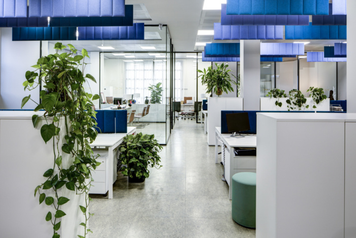 回到大厅,一条走廊的墙壁被漆成蓝色,角落里的霓虹灯以新概念主义艺术家彼得·哈雷的画为灵感,引导我们穿过紫红色的门到达办公室的开放空间。在这个区域,颜色被用来构建一条视觉路径,从走廊的黑白到红色的门,再到一个大房间,白色的阴影加上重要的蓝色。