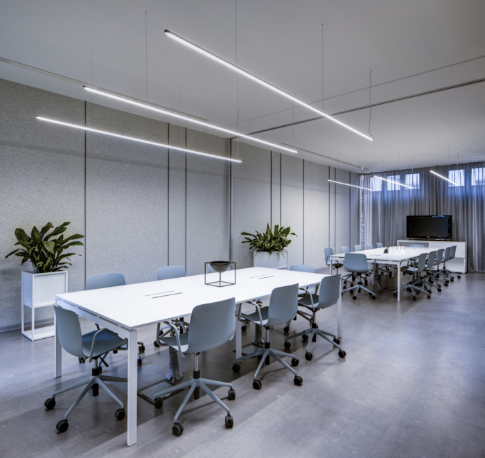 签署的该项目的主旨是使用透视错觉,使用色彩在内部对比之间创造路径,以“有形”的轻盈为名,几乎强调了实质沟通背后的创造性工作的具体性。从迎接我们的大厅有一张长长的白色照明和几何形状的背光穿孔金属板办公桌,通向该机构的会议室、办公室和 Buvettes。#办公室装修设计公司#