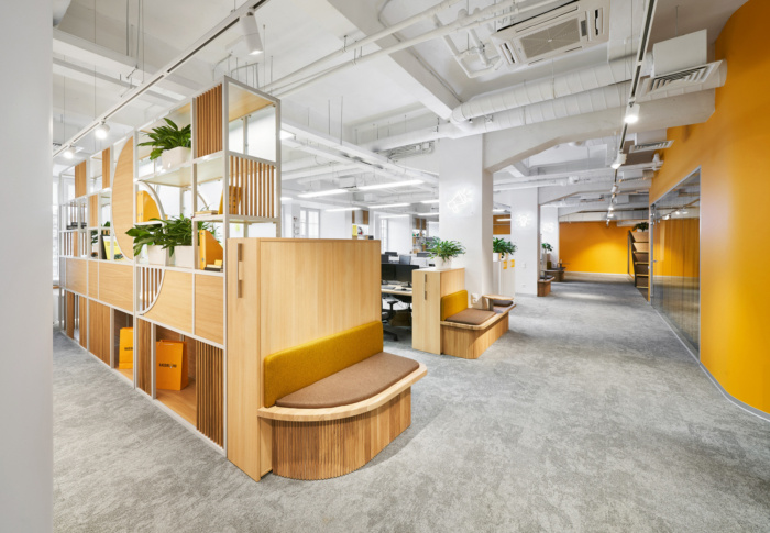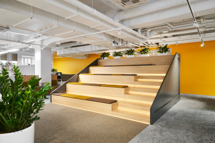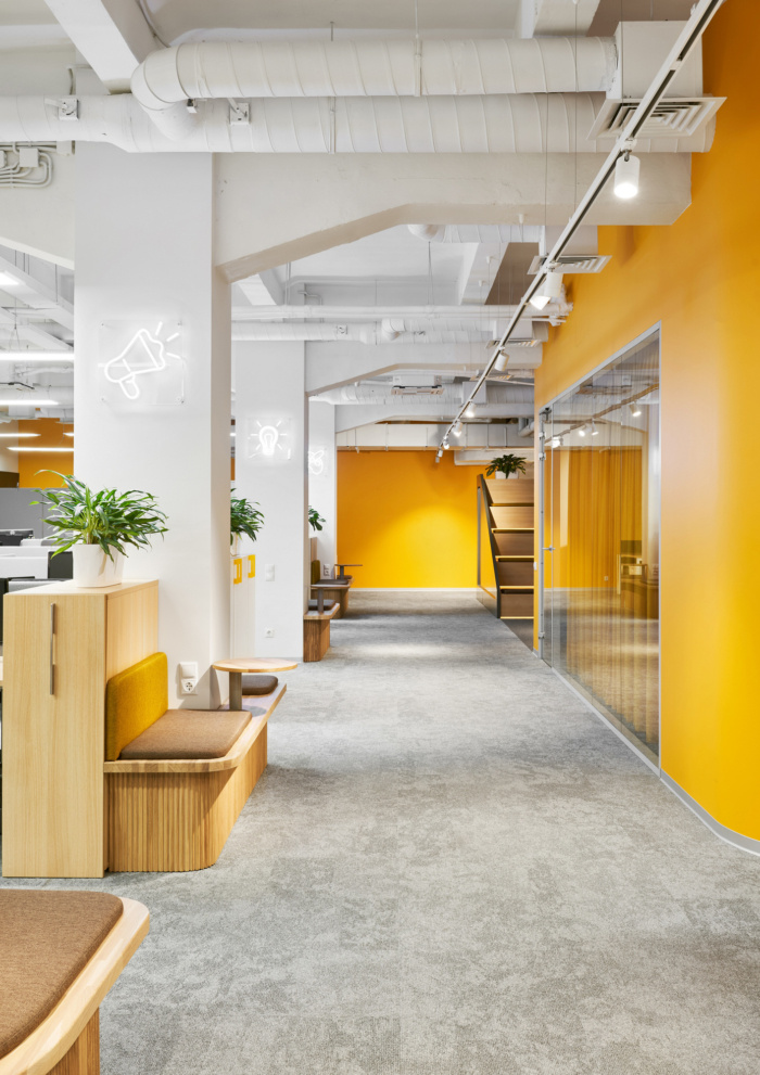 在办公空间规划的中心位置有圆形的会议室,将开放空间分成两个翼,室内设计的主要颜色是黄色?;嵋槭仪奖谟懈粢籼畛湮?,隔音窗帘完全阻隔一切噪音。大约50个工作场所位于工作区。每个工作场所都有桌面隔音屏,部门之间由楼层高的移动隔断隔开。便利的内置座椅和桌子位于过道沿线,可让您舒适轻松地使用笔记本电脑工作或与同事交谈。#广州设计公司#