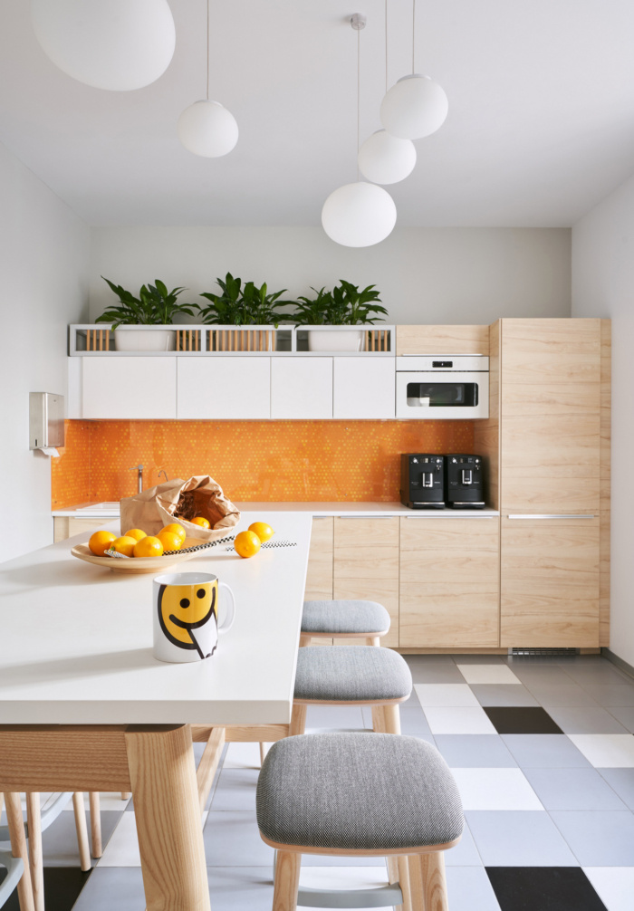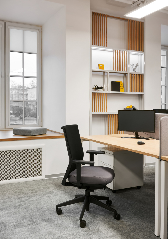 会议室位于讲台附近,是一个通用报告厅,适合短期会议、空闲时间、活动等。在讲台的背面,该设计提供了打印机区域和咖啡点。一个不寻常的解决方案是在办公空间积极使用窗台。它们的尺寸为3×1.5m,用作围绕开放空间区域周边的休息区。