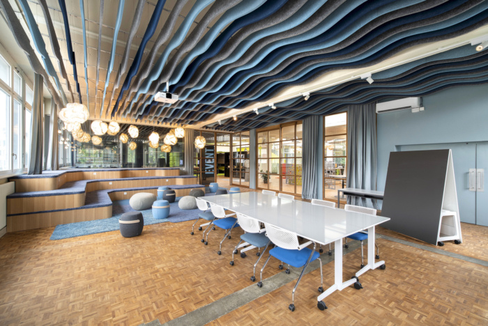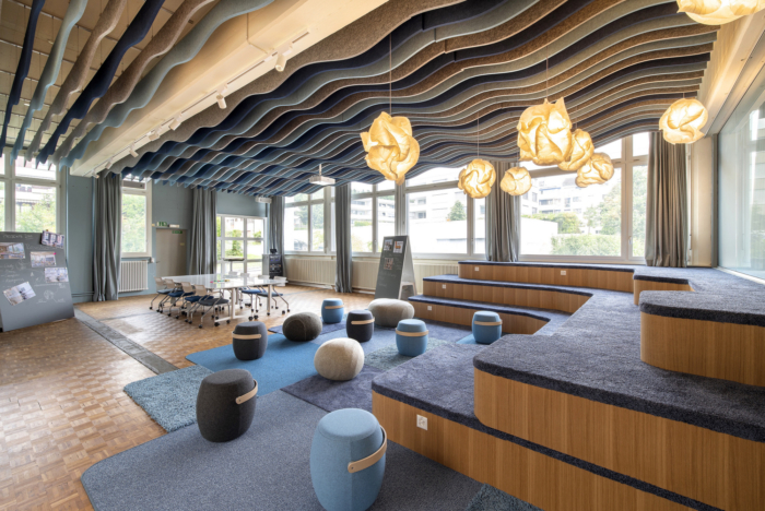 大型中央展示空间的灵感来自当地的湖泊。吸音天花板让人联想到水和波浪,圆形剧场风格的座椅类似于海滨台阶的景观,毛毡鹅卵石充当便携式座椅。