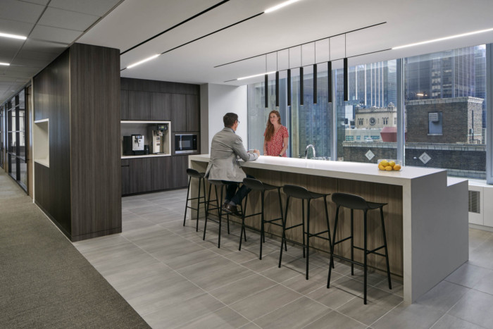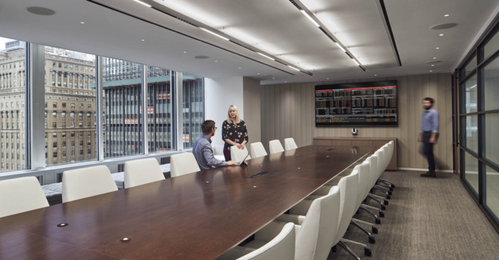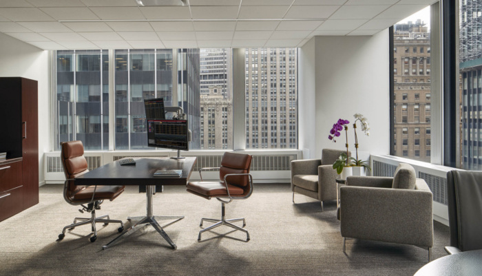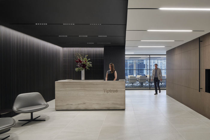 入口处是由坚固的石灰华石制成的接待台,背景是黑色木板格栅。配备高端家具的办公室,以及大小会议空间、开放式工作空间和隐私电话室,排列在空间的周边,结果是一个豪华、精致的工作环境。#办公室装修公司#