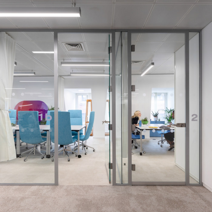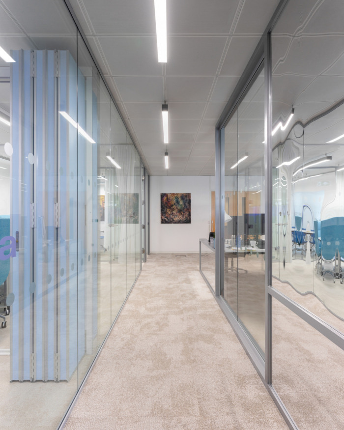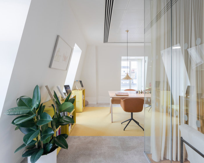 整个玻璃或镜面隔断最大限度地提高了空间感,而办公室空间中元素的方向和设计则最大限度地利用了日光。几乎所有元素(窗帘、隔板)都是南北走向,以保持尽可能多的北极光。尽管存在明显的矛盾,但这些策略同时实现了开放性和隐私性。