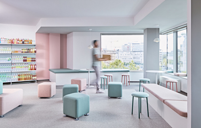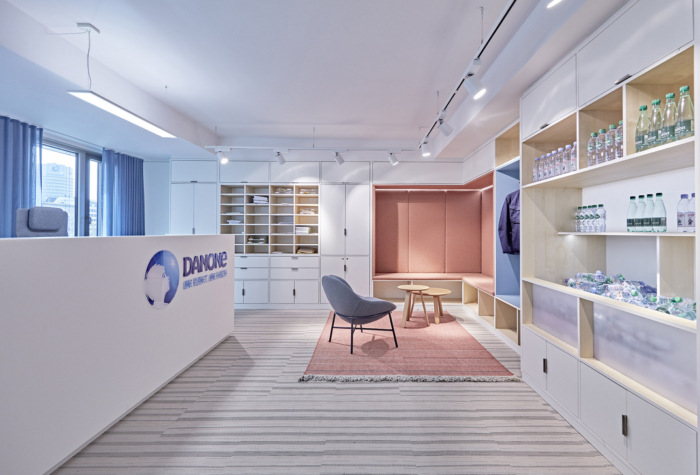 设计理念与企业各个实体的 CI 颜色保持一致,并将它们结合在松散的家具和室内装潢材料、地板饰面和墙壁织物中。