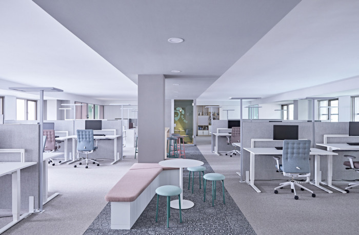 根据业主的要求,从2楼到6楼设计了一个由开放空间、会议区和休闲空间组成的紧密网络的办公室空间结构。