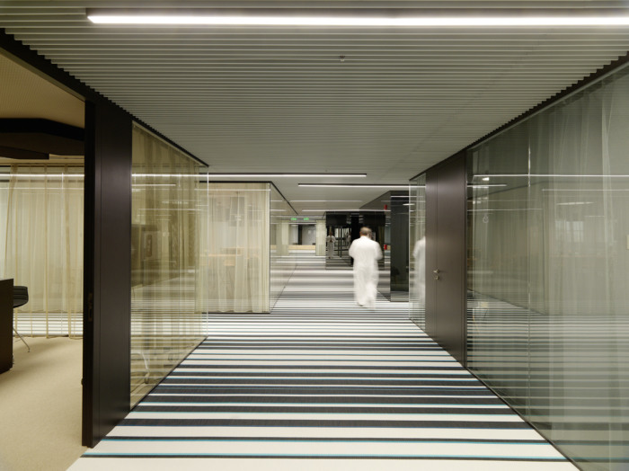 欢迎区设有定制展示,展示与公司历史相关的企业图形,并提供接待区、等候室、陈列室和客户会议室,营造愉快、信息丰富且引人入胜的环境。位于中心的村庄将其上下文方法转化为功能布局,充当信息十字路口和交流区。
