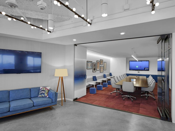 最后,设计团队精心地将关键的便利设施、会议和焦点空间分散在两层楼中,使这两层楼都成为员工和客人的理想目的地。楼层由大堂楼梯相连,楼梯向下而不是向上。该团队通过设计一个特色墙/天花板元素来完成这一设计挑战,该元素从接待台的后面和上方突出,穿过大厅和楼梯,以自然地将视线吸引到连接的较低楼层。