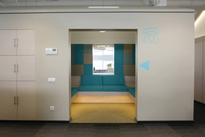 灰白色的吸音板和圆柱灯形成了员工友好的声学环境