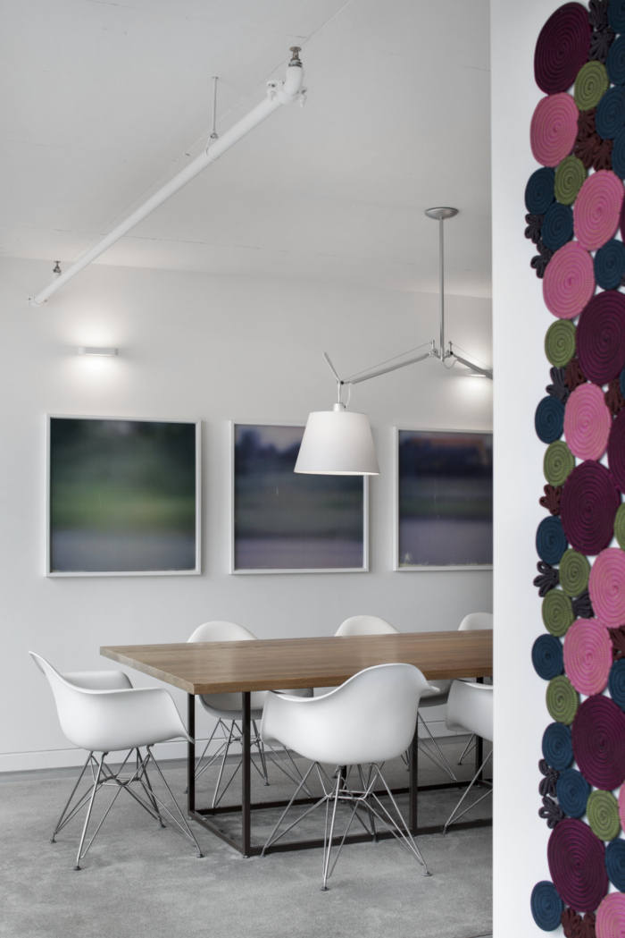 调色板是中性的,开放区域被桌子打断,周围的白色和秩序让工作室的创作自由自在。年华泛黄的灰桌,如今染成了灰色。视觉和声学屏幕是定制设计的,以减少大玻璃窗和混凝土表面产生的回声。#办公室装修效果图#