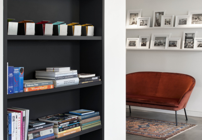 整体橱柜,全黑色,与房间的门结合在一起。他们创建了一个集合并将空间连接在一起。忠实的供应商参与了这个办公室陈列室:恋物癖灯、梳妆台和用魁北克石头装饰的厨房、当地工匠制作的家具、艺术品、地毯等。