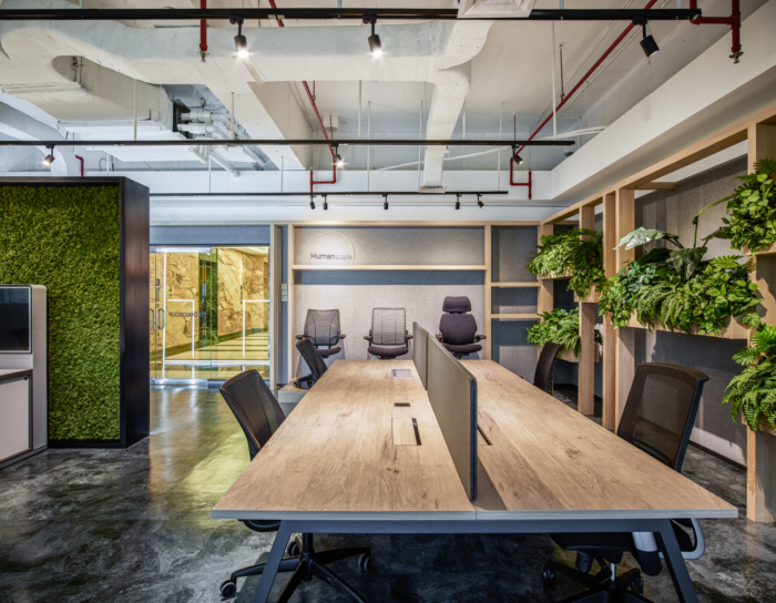 开放式天花板最大限度地提高了整体高度,而覆盖着毛毡的墙壁提高了开放空间的声学质量?!鞍背铝惺仪虻哪窘峁沽楦欣醋源车挠《饶嵛餮墙ㄖ际?。与可固定的毛毡墙一起,它为样品和模型创建了一个灵活的显示系统。办公区的家具是单色的白色或黑色,与当地工匠手工制作的质朴木台面和藤灯并列。入口处的特色苔藓墙和陈列室区域郁郁葱葱的种植园传达了品牌以可持续发展为重点的方法,并在视觉上与周围环境联系起来。