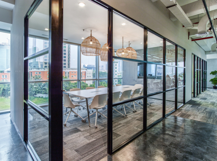 整个空间中使用的原始和自然饰面和纹理,如水泥、木材、毛毡和金属,传达了诚实、真实、工艺和人性化的方法。未来派特色标牌墙欢迎参观者,其标志以黑钢、LED 灯和苔藓作为背景重新诠释。陈列室和办公区相互连接,然而,带有传统印尼剪裁图案的屏风创造了一种隐私感。#办公空间设计#