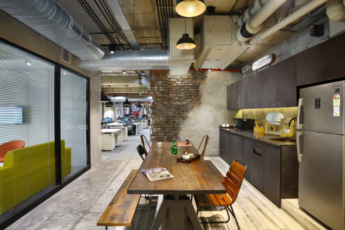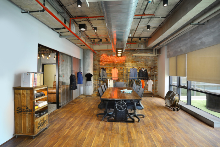 办公室空间设计需要反映复古服装,这是通过空间的外观和感觉实现的。牢记这一点,品牌标志是在生锈的金属板上完成的,背景是旧枕木。除此之外,还有一面图形墙,突出了他们的核心价值观——激情、创造力、质量、家庭、个性和乐趣。