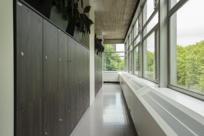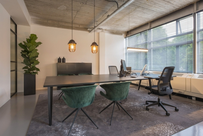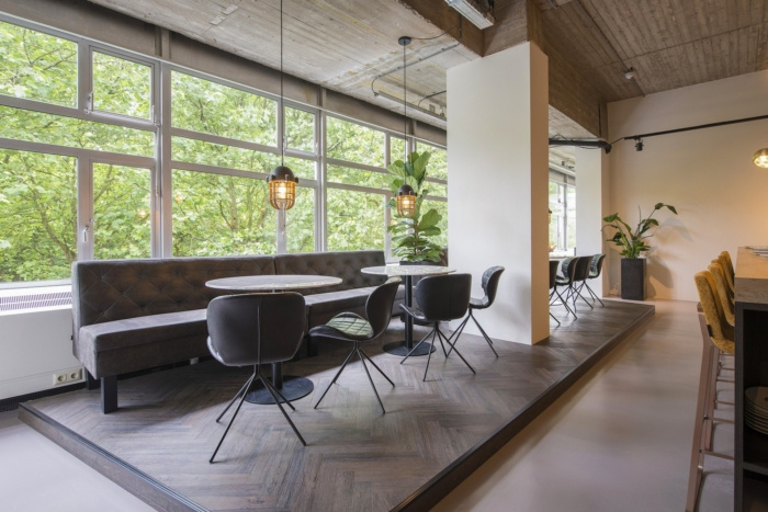 办公室的中心是厨房和休息室,这是与他人进行更多休闲会议的好地方。这是一个很棒的现代办公室,以暖色调作为对比。展示柜是用原钢定制的,它与其他隔墙配合得非常漂亮。