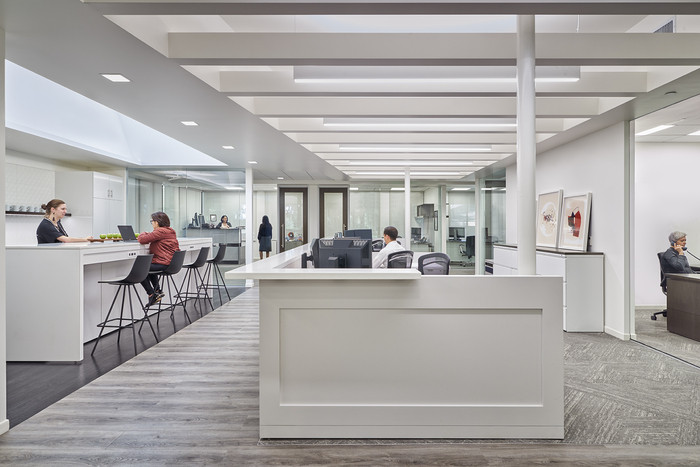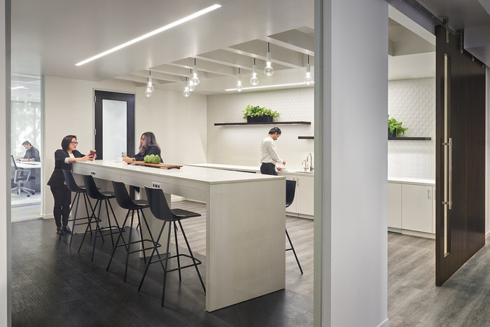 通往二楼的通道是位于引人注目的天窗下方的光滑中央楼梯。新楼梯由透明玻璃板和定制金属栏杆构成。玻璃前的私人办公室与开放且日光充足的咖啡吧共享空间,邀请用户参加快速的触摸式会议以及周五的比萨饼和酿造。现代建筑元素,金属元素和玻璃跨度,为现代色彩丰富的艺术提供了完美的画布,同时表达了具有全球焦点的客户的个性和文化。