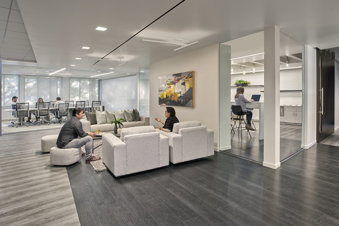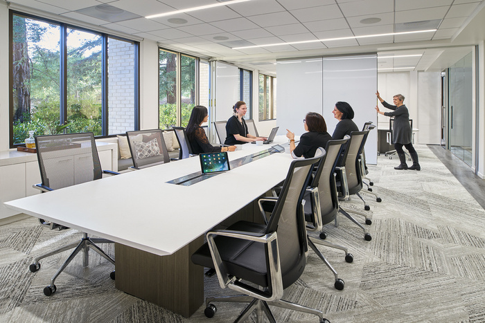 一楼是指定的“交易场所”,可轻松容纳大小团体会议。它被设计成一个会议中心,包括一个被会议室包围的“舒适”休息空间。董事会会议室设有白板可移动墙,提供扩展空间的机会。每个会议室都有完整的音频/视频功能,包括受控照明和窗帘。#办公室装修案例#