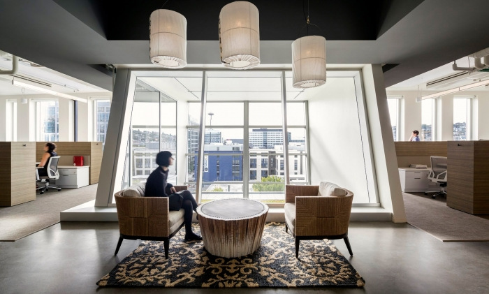 一条宏伟的“木板路”用于组织空间,将客人从主大厅和接待处吸引到陈列室和模拟商店以及协作工作区。木板人行道上的休闲座位区为非正式聚会提供了机会。自然光通过充足的外部玻璃窗涌入办公室,最显着的是通过三个大型全玻璃监视器,这些监视器投射到流通空间中,并在视觉上将每一层楼与下面的市场大厅连接起来。