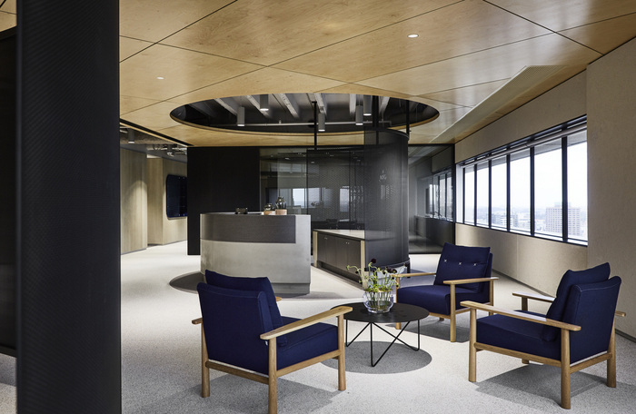 在整个项目中,混合了原始和精致。裸露的管道系统和天花板服务由温暖的木材和织物镶板平衡。电梯大堂的镜面天花板在低矮的天花板空间中创造了高度,叶片墙和网格靠在弯曲的形式上,以便人们在圆形地板中定位自己。