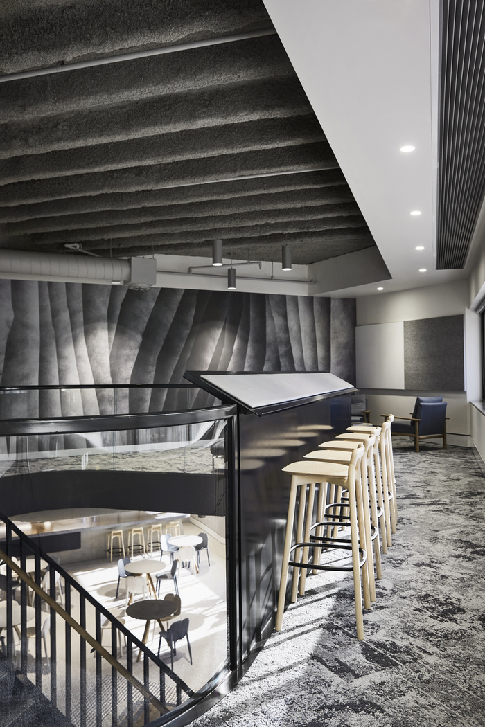 凹槽混凝土墙与天鹅绒家具内饰也形成了对比;在人流量大的区域,山羊毛地毯紧靠硬质石英地毯。#现代化办公室装修#