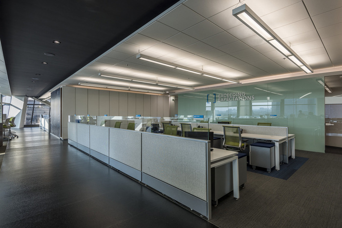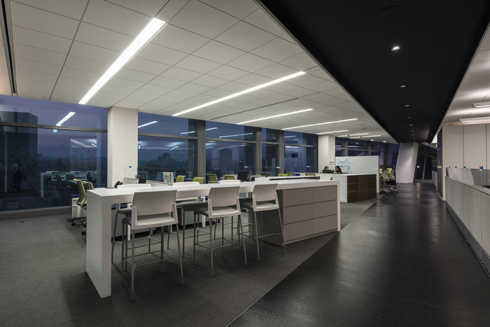 以与内部的立面关系和更好地利用自然光为出发点,除了平面图的矩形配置外,该项目还解决了沿整个布局相交的两个主轴。产生由中心的服务核心连接的四个分开的协作区域。#办公室设计图#
