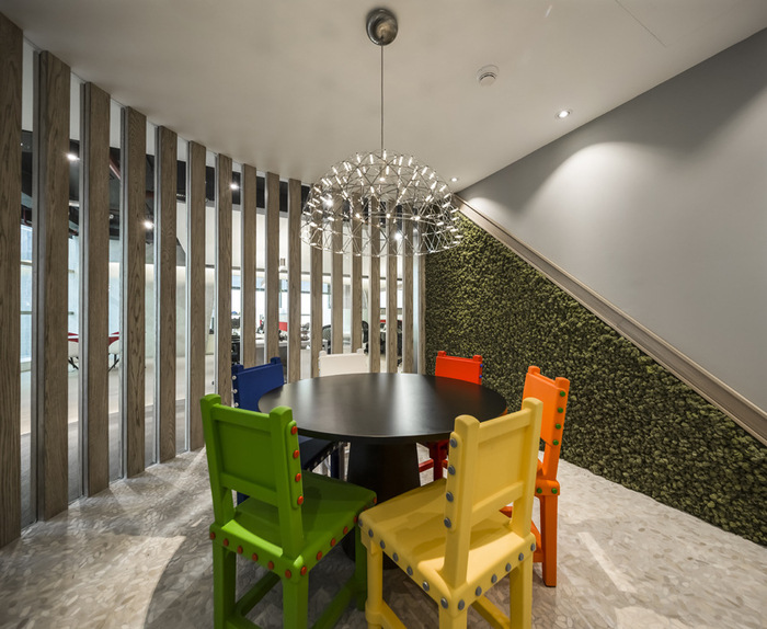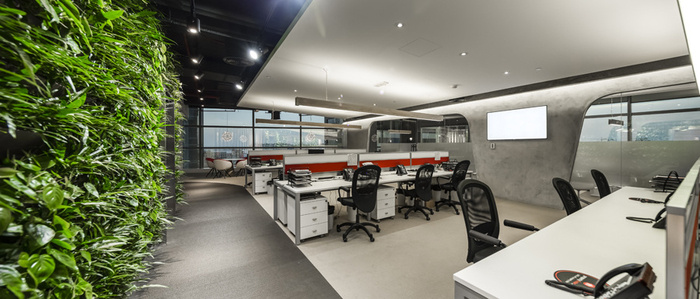 在主要销售大厅的喧闹声中,是一堵长长的绿色墙壁的对比平静。围绕销售大厅的全长平面的宽大体现了元素的极简主义。办公室的设计创造了各种会议中心,旨在营造不同的氛围。设有户外主题会议室、作为主会议室的别致框架木箱、带软垫的电话亭以及享有壮丽景色的非正式会议区。一扇隐藏的门通向意想不到的巨大储藏室。