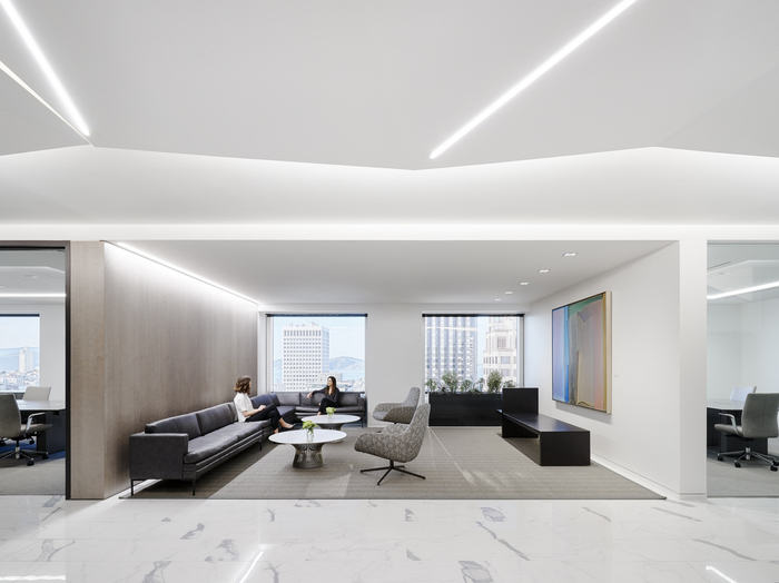 首次进入该公司办公空间时,访客会立即被一个带有线性照明的黑暗电梯大厅所包围,将焦点引导到明亮的接待区。接待台后面折叠的垂直元素成为天花板特征,穿过内部会议空间,并将接待区与优雅的连接楼梯和湾区全景连接起来。