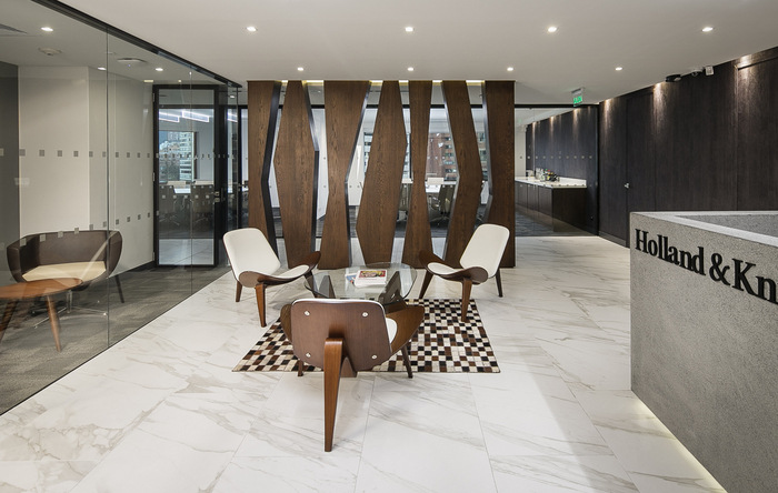 以树林为灵感,作为新自然空间的入口,接待处采用大理石、木材和墙纸,与间接照明形成鲜明对比。这是体验的开始,客户可以留在等候区,观看在树上激励的雕塑师。