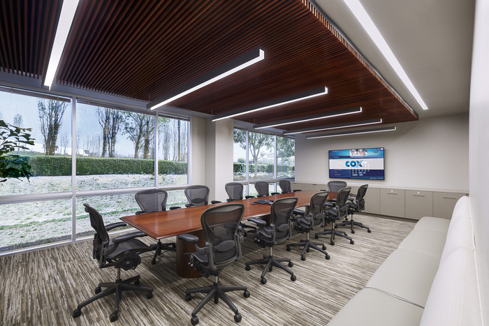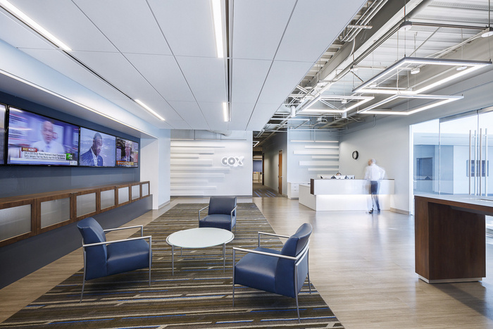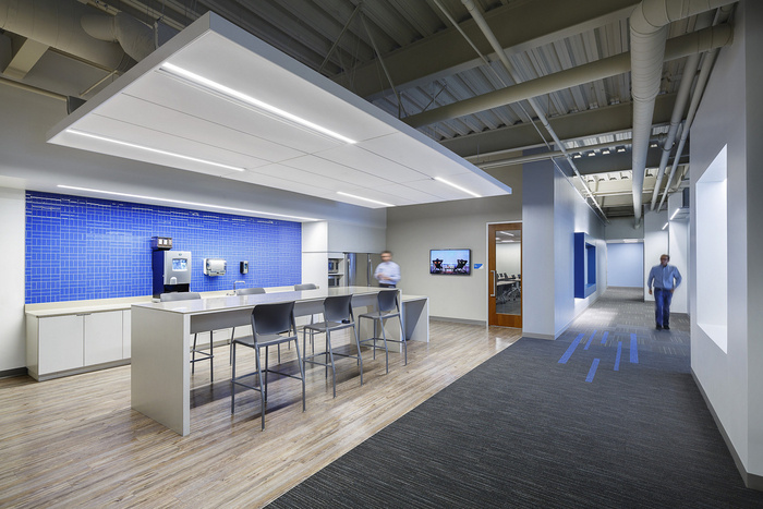 明亮的白色外露天花板和管道系统与整个空间的灰色地平面形成对比,“考克斯蓝”的流行音乐随处可见??攀叫菹⑶牟AУ舶?、座椅装饰和干墙装饰墙比比皆是。由此产生的设计是对企业品牌的清晰而有意义的诠释。