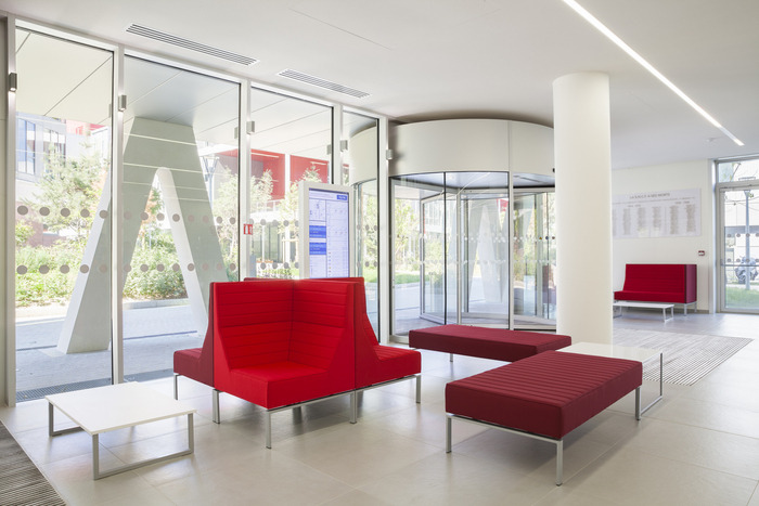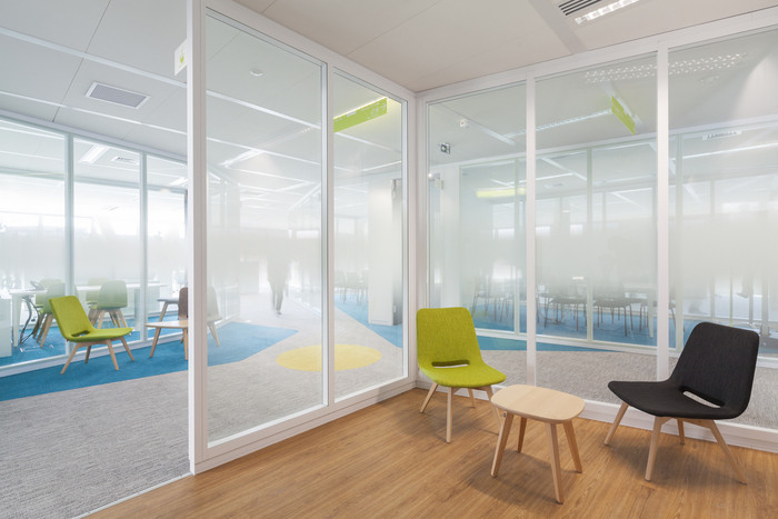 设计师使用地毯来标记会议室,并为建筑物的每个翼楼选择了不同的颜色(红色、蓝色、黄色和绿色),项目中的标牌与机翼的颜色相对应。#办公室空间设计#
