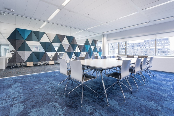 几乎在办公室的每个场所都有蓝绿色比例尺的破碎的肘部人物图案。它们不仅反映了公司的企业形象,而且还为该地区增添了活力,并传达了持续发展和方法的独创性,这是精通技术的企业的关键技能之一。