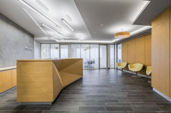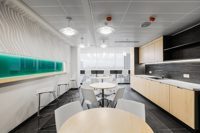 开放空间的照明是为了补充“波浪”天花板 - 与波峰平行排列的线性灯,强调它们的体积并产生眩光,使它们活跃起来。严谨、线性、饱和的办公室设计被不显眼的波浪和水的主题冲淡,伴随着白色和清晰,光影对比,反映在天花板和垫子的设计上。
