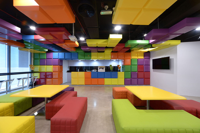 娱乐区的形成源于对世界著名的俄罗斯方块的重新诠释,俄罗斯方块是 80 年代视频游戏行业的标志,其明亮的 VGA 色彩。